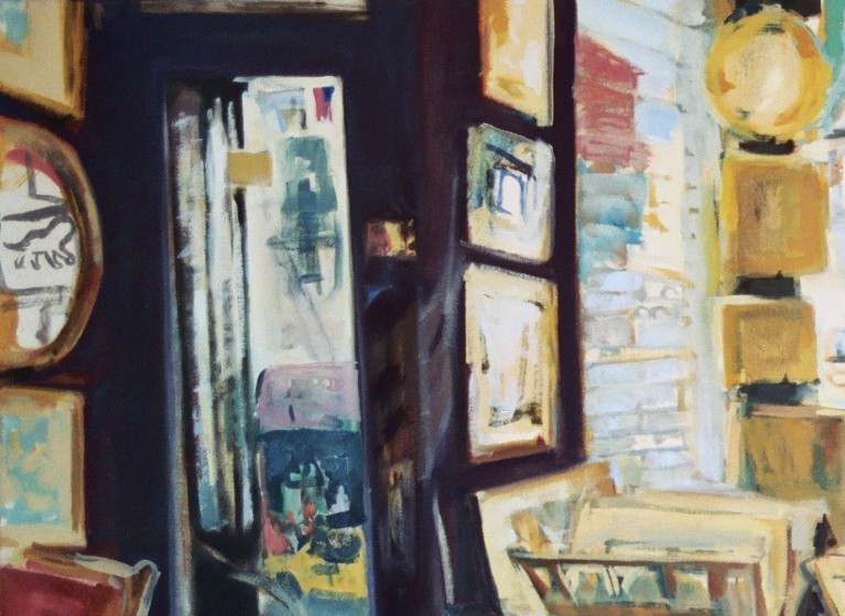 Details are mysterious little thingies. This is a detail of a painting of the inside of a print shop in NYC that I worked in for a month in the 1990s. I drew the crowded shop walls and the little glimpse of street I could see from the shop desk. See, there’s a reflection of a print of a lion in the mirror on the left-hand wall. Or- is it even possible for someone without a memory of that spot to be able to tell that it’s a reflection of a print of a lion? There’s not much there- it’s more of a hieroglyph that means “this is a reflection of a lion-like picture that must be on the opposite wall of this room.” Details are probably a lot clearer to the artist than to the viewer.
