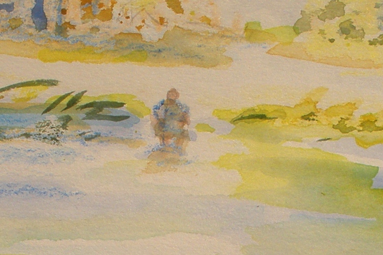 How much of a scribble does it take to say, “that is a woman hoicking up her skirt and wading into water”? This is a little detail in a watercolor and crayon painting, and the figure is about as big as my fingernail.